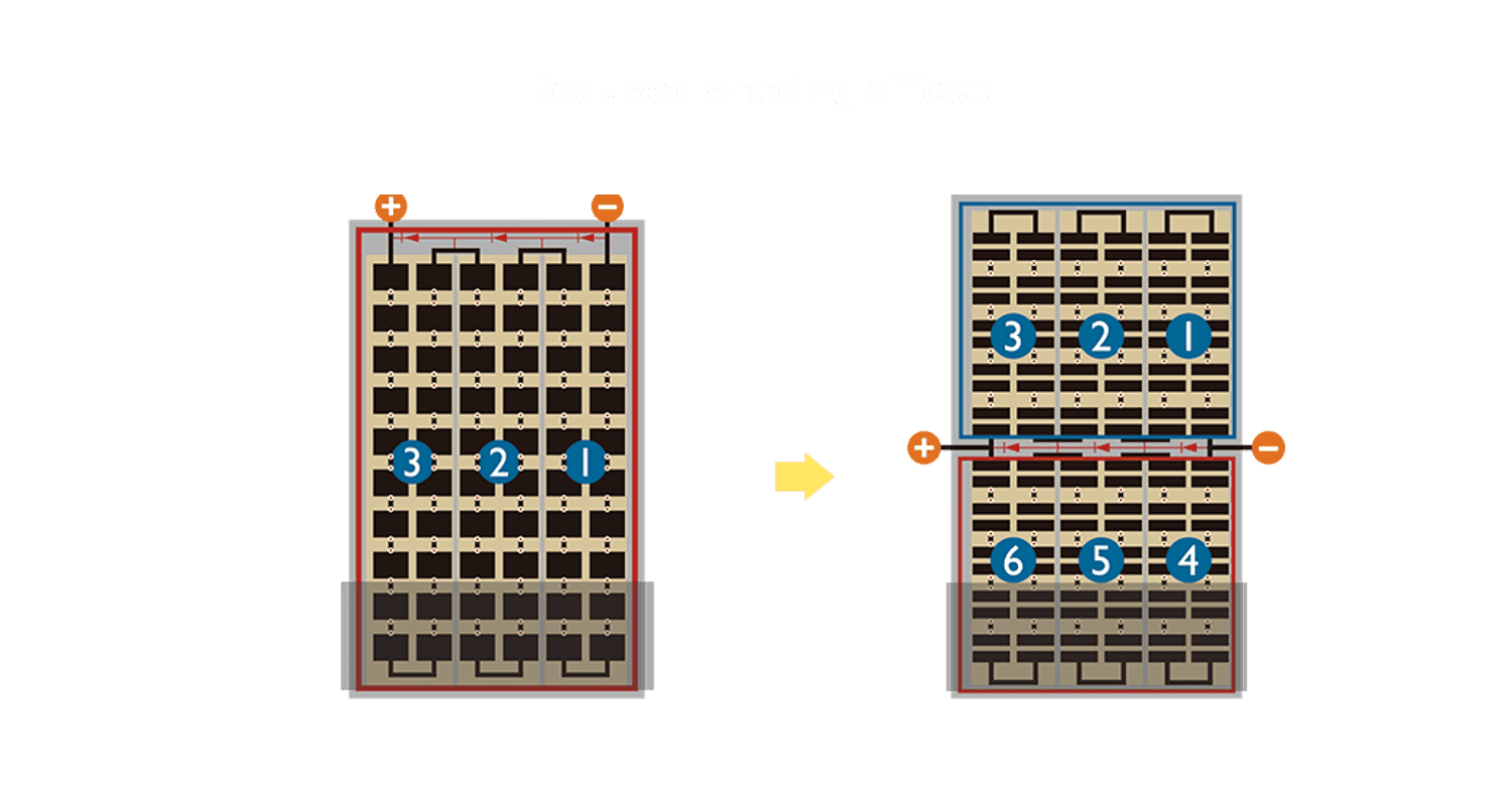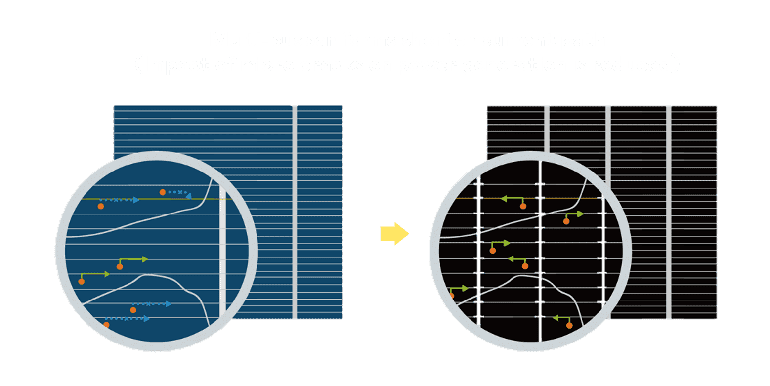 - 电池使用多条铜导线 (Copper wire) 于电池片上形成较短的电流路径,,提高电流收集效率,,采用圆形设计的铜导线较传统扁平式的铜焊带 (Ribbon),,,可增加入射至电池的光线量。。。